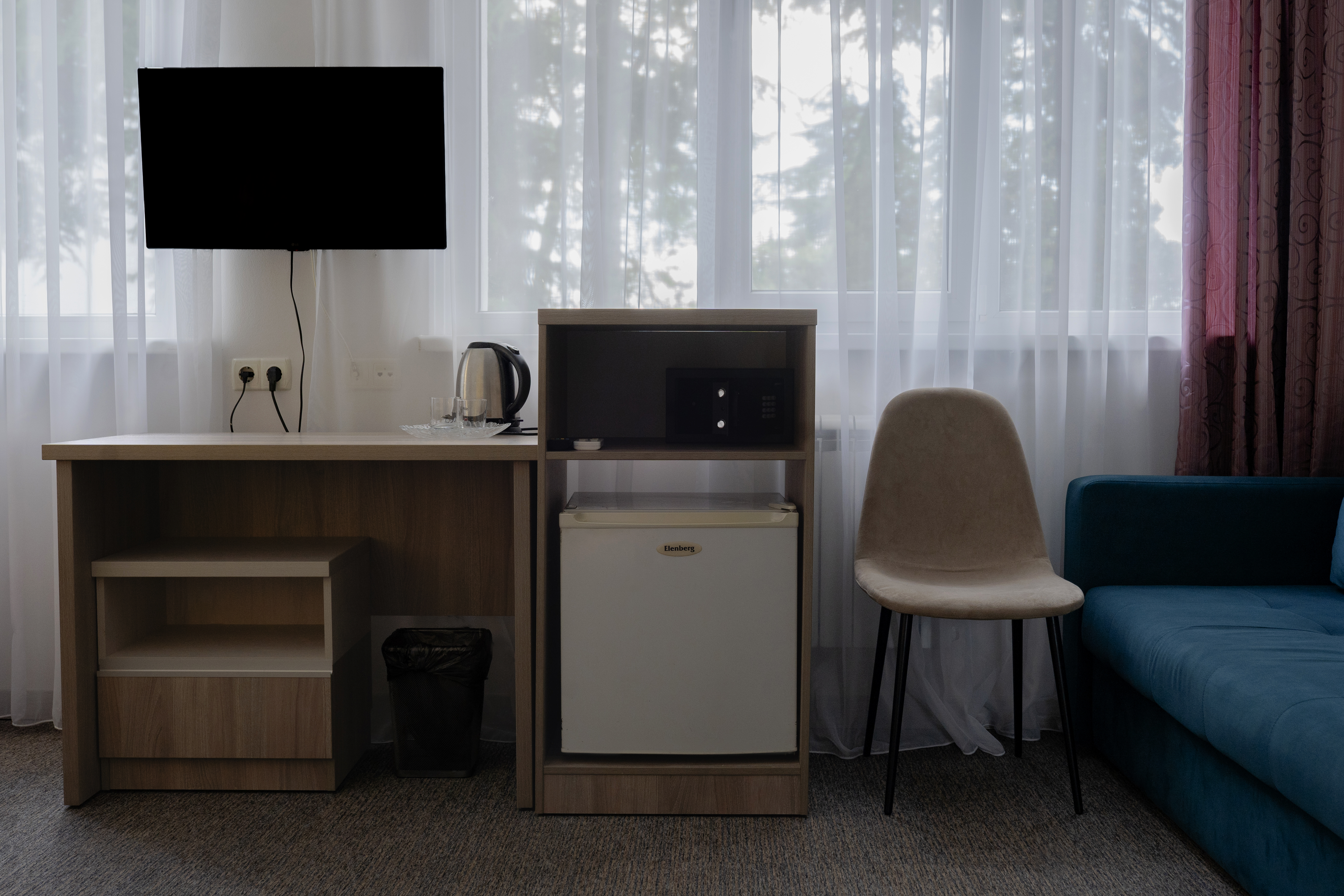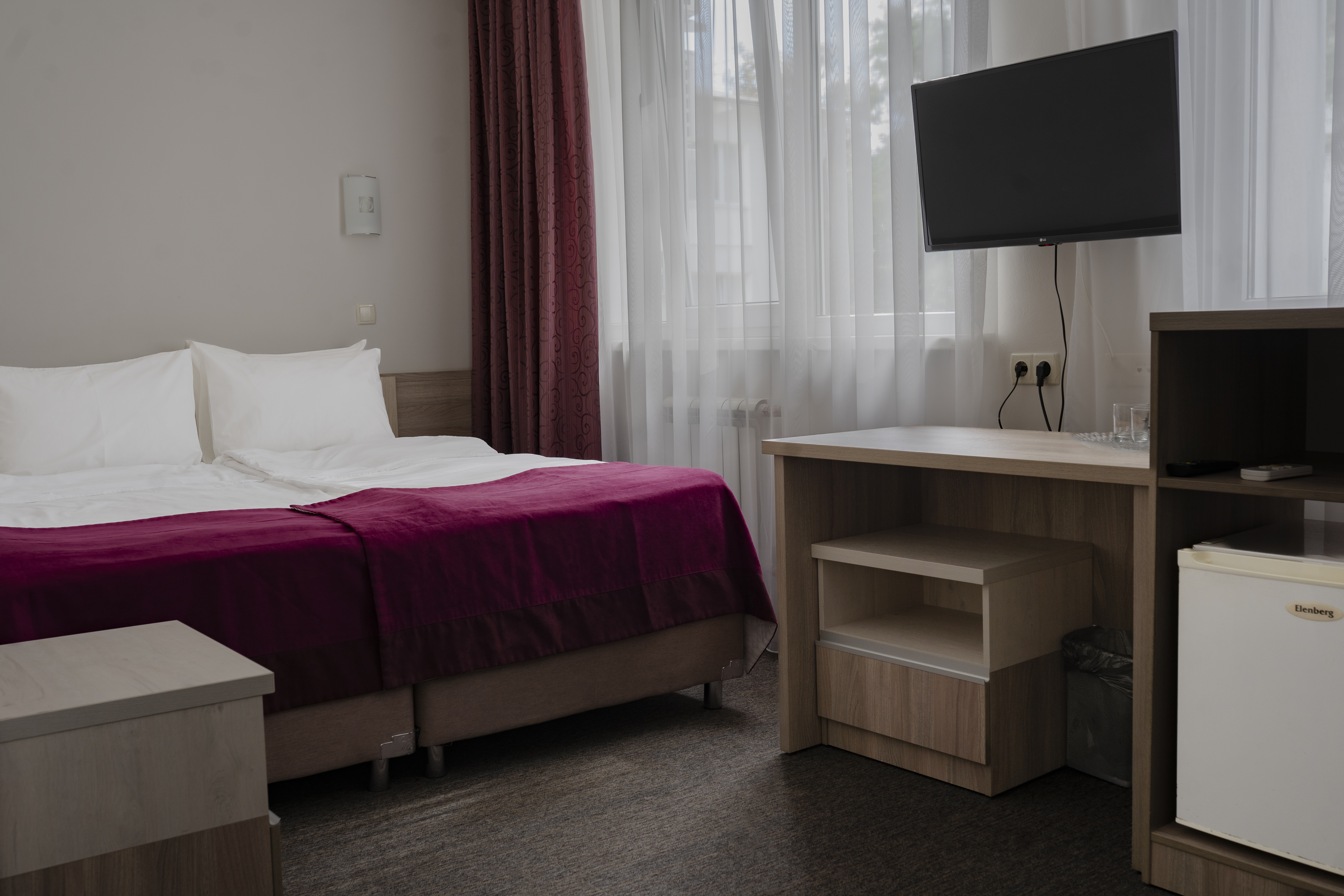«Комфорт» без балкона – однокомнатный номер площадью 20 кв.м., идеальный пример для гостей, предпочитающих отдых с родителями или детьми. Номер оборудован удобными односпальными кроватями, дополнительным местом – креслом или диваном, сплит-системой, телевизором, холодильником, шкафом для одежды, чайным набором, сейфом, электрическим чайником, санузлом с душем. Все это обеспечит оптимальные условия для прекрасного отдыха.